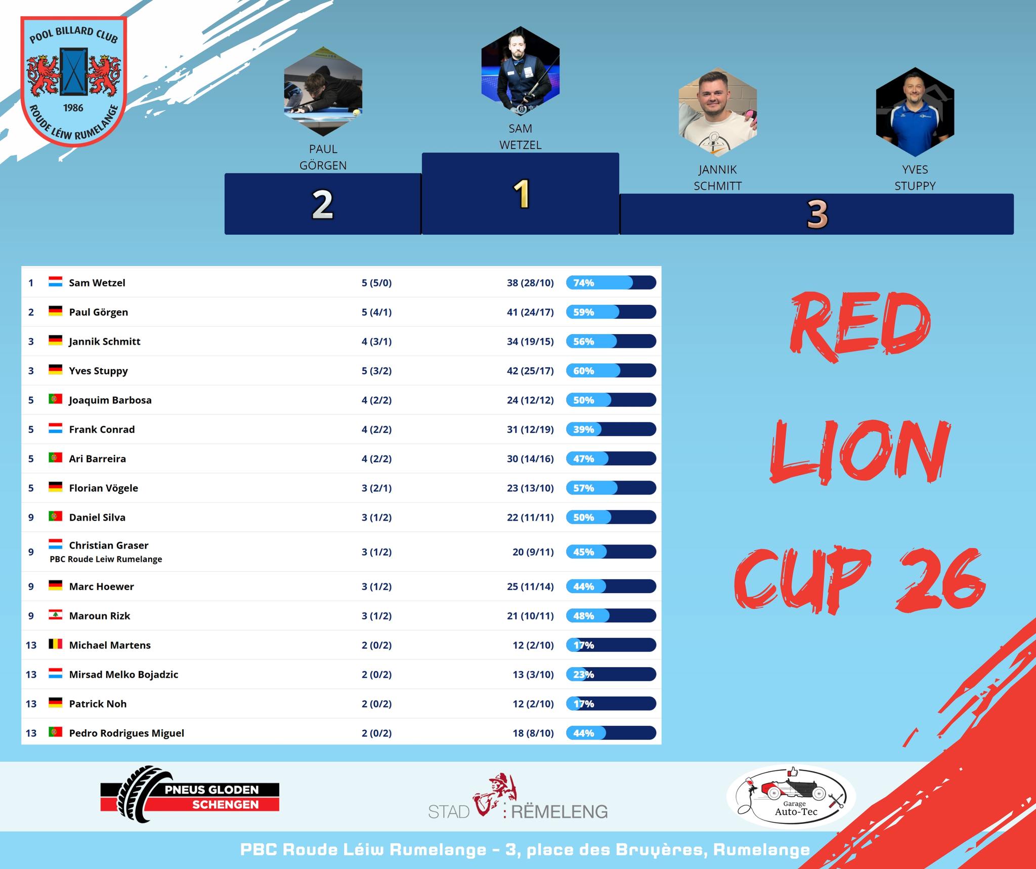 Yesterday the 28th Red Lion Cup Finals took place at PBC Roude Léiw Rumelange, bringing together the best players from the qualification rounds for a great day of pool and competitive matches. 🎱